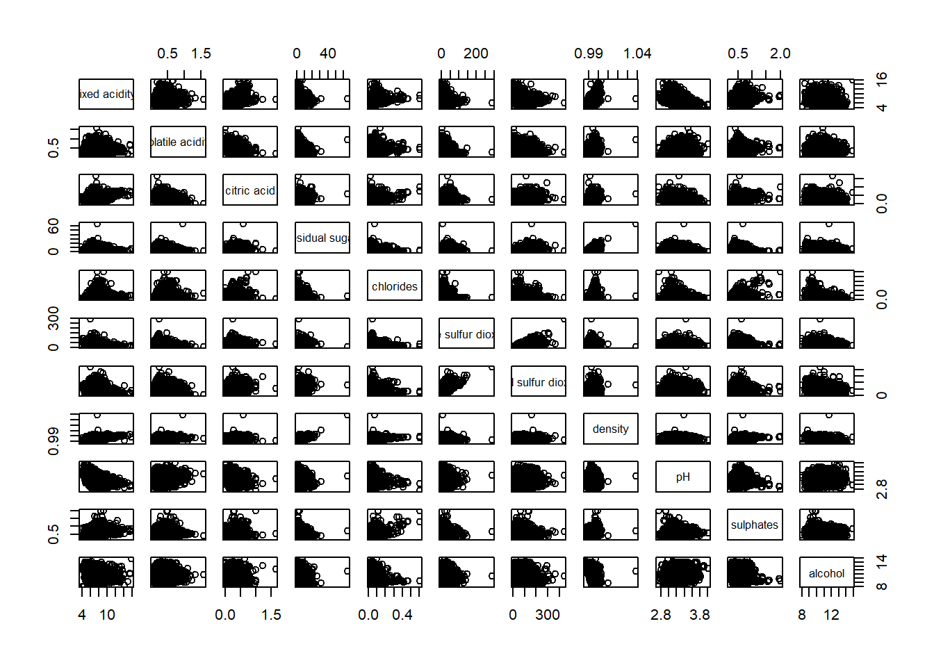Columns 2 to 12 of wine dataframe is used to build the scatterplot matrix. The variables are: fixed acidity, volatile acidity, citric acid, residual sugar, chlorides, free sulfur dioxide, total sulfur dioxide, density, pH, sulphates and alcohol.