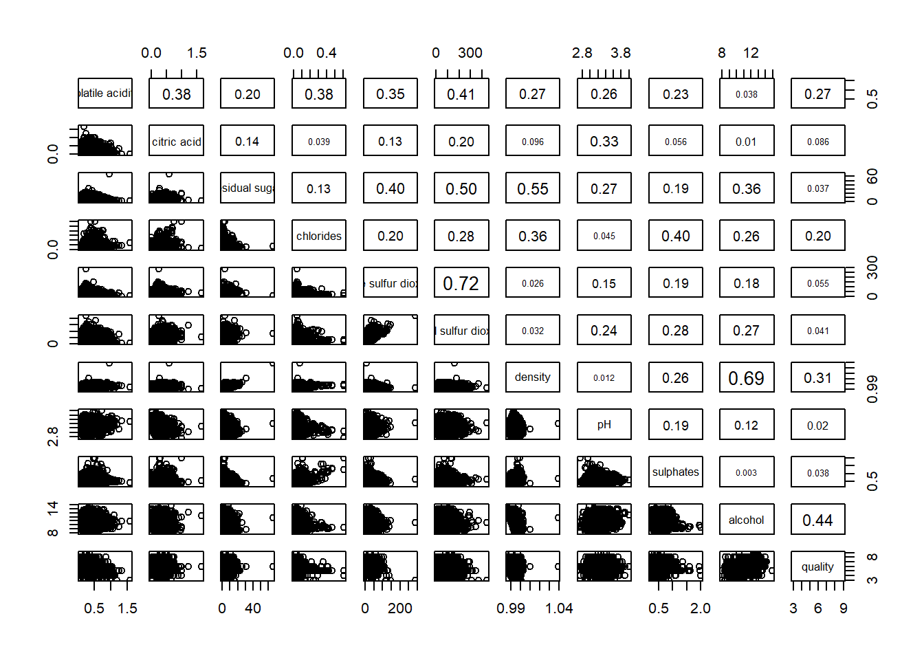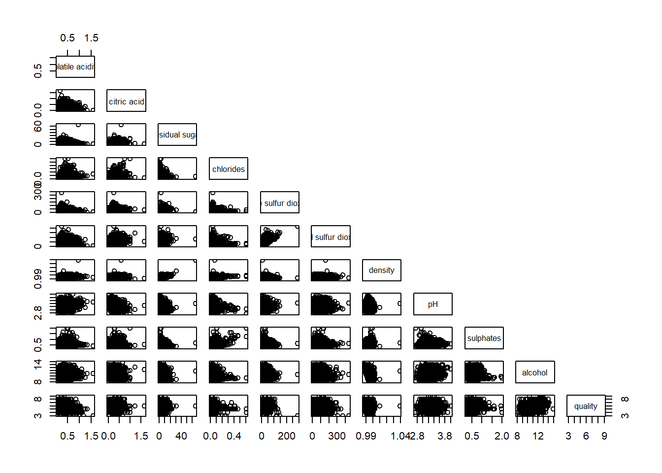 Figure below shows a mixed layout corrgram plotted using wine quality data.