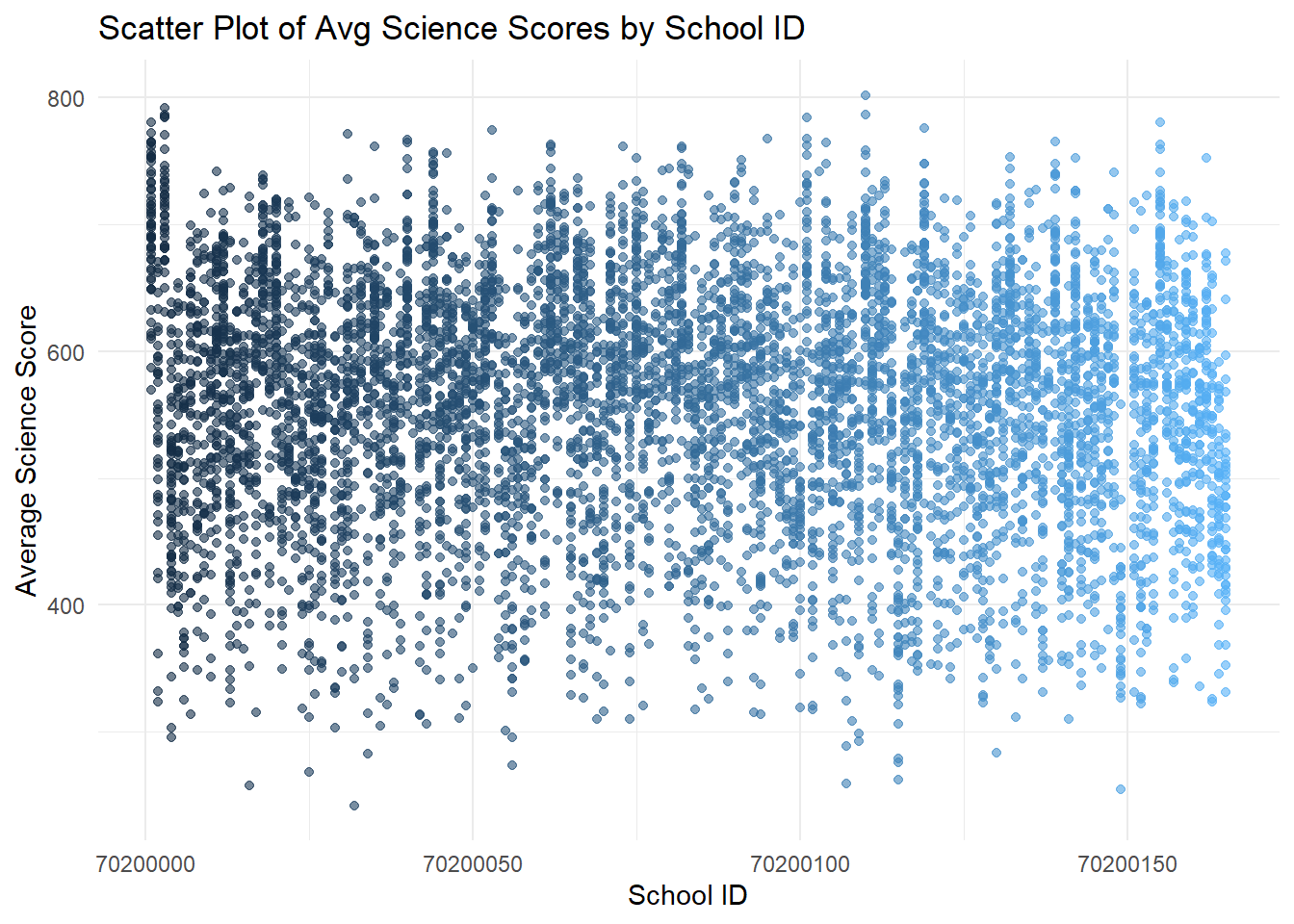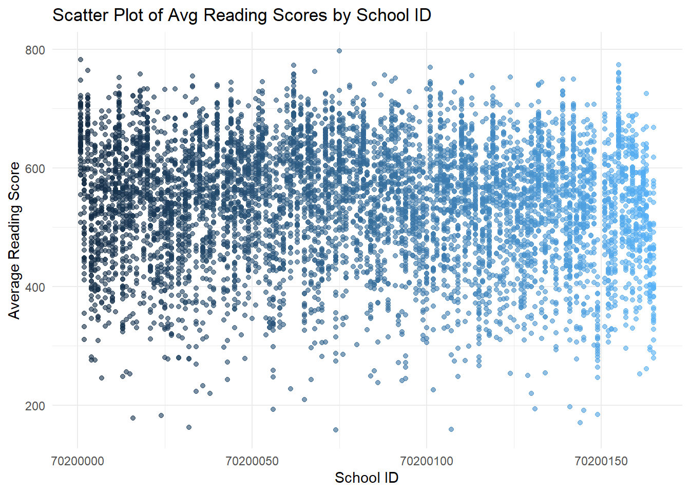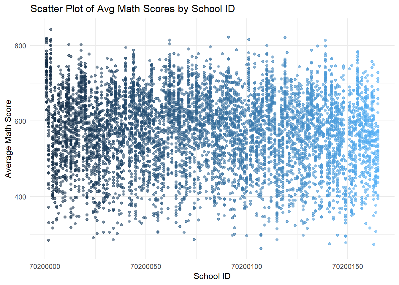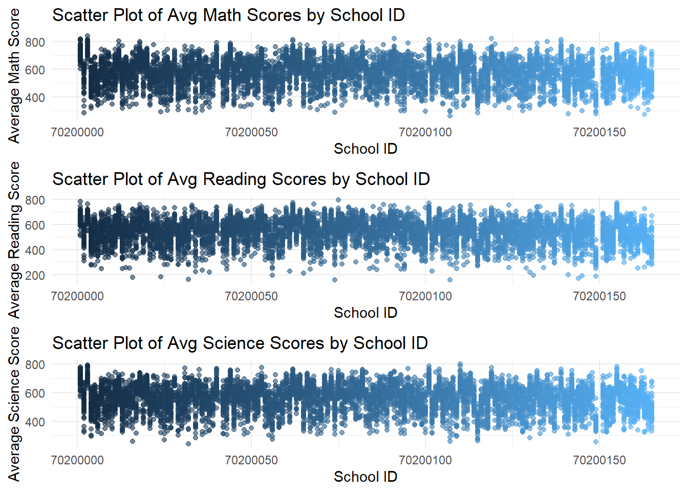 - The first set of scatter plots shows a wide distribution of average scores across schools, with no clear pattern based on school ID.