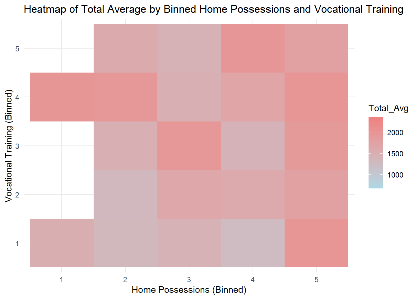 labs(x = "Home Possessions (Binned)", y = "Vocational Training (Binned)", title = "Heatmap of Total Average by Binned Home Possessions and Vocational Training") +