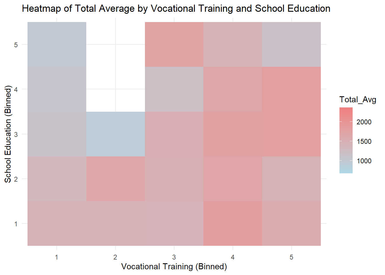 labs(x = "Vocational Training (Binned)", y = "School Education (Binned)", title = "Heatmap of Total Average by Vocational Training and School Education") +