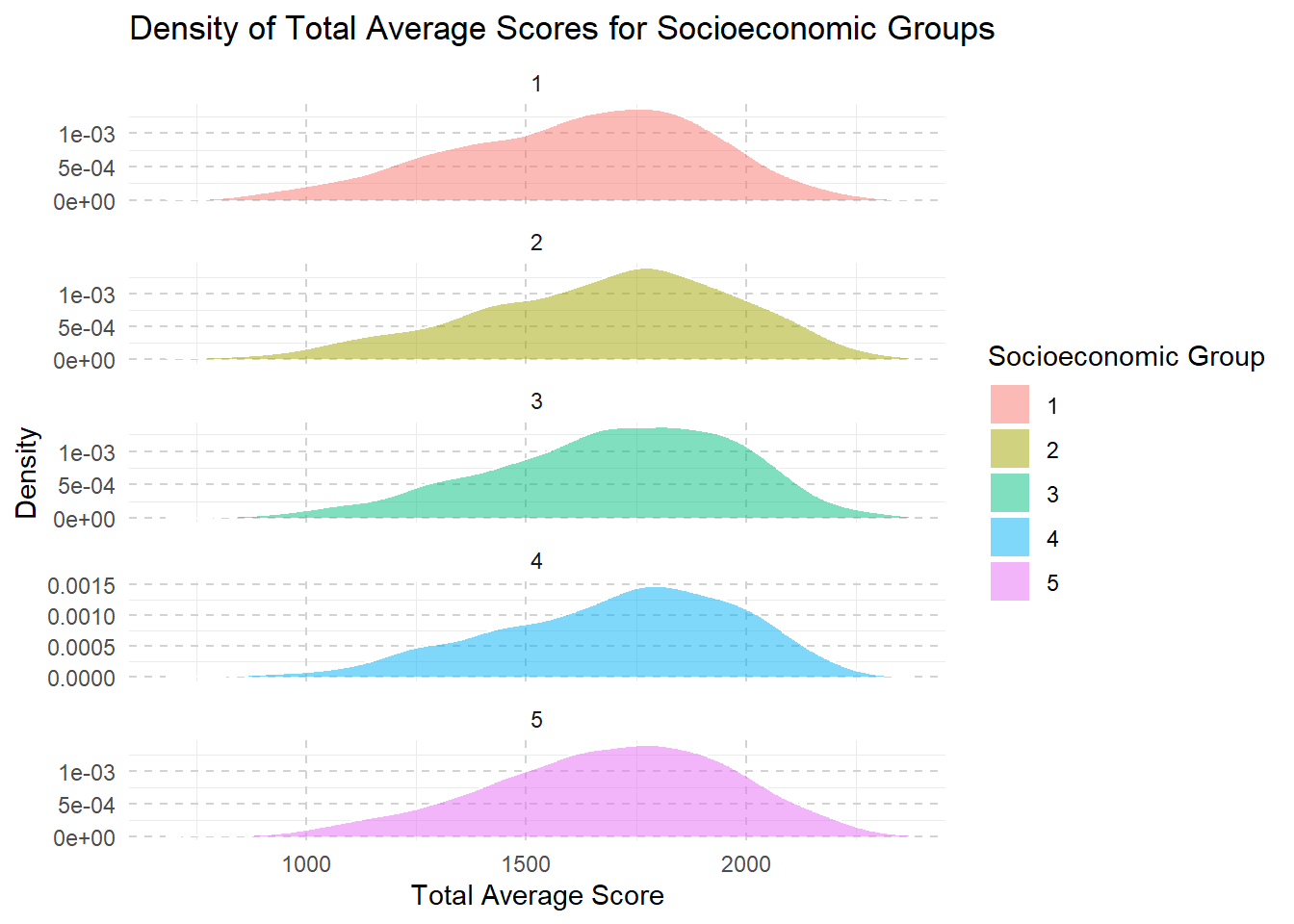 labs(title = "Density of Total Average Scores for Socioeconomic Groups",