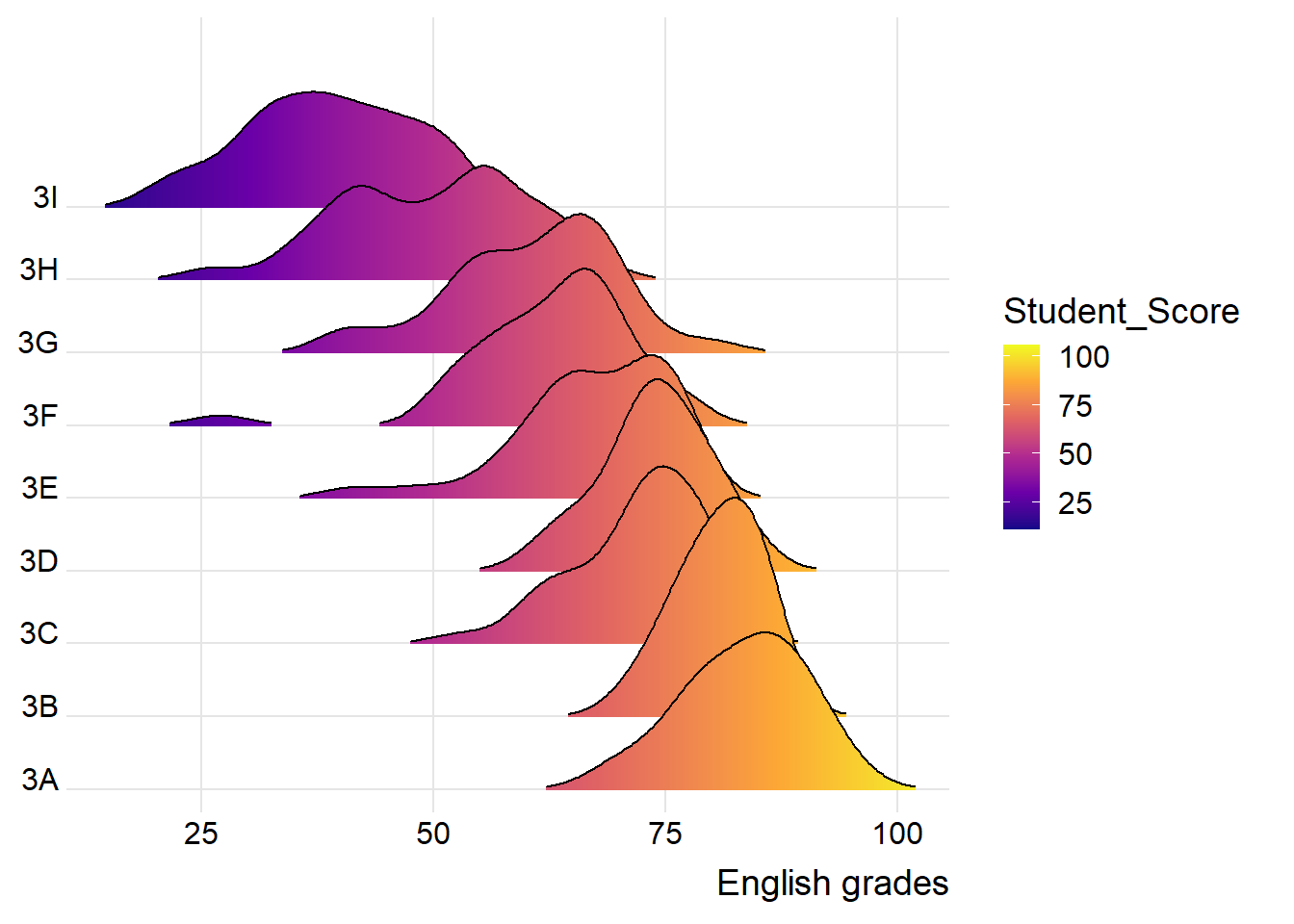 Figure below is a ridgelines plot showing the distribution of English score by class.