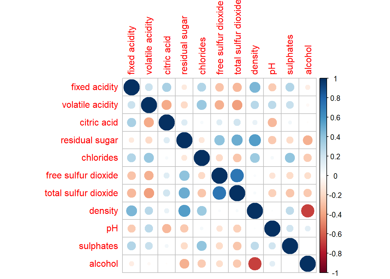 wine.cor <- cor(wine[, 1:11])Next, corrplot() is used to plot the corrgram by using all the default setting as shown in the code chunk below.