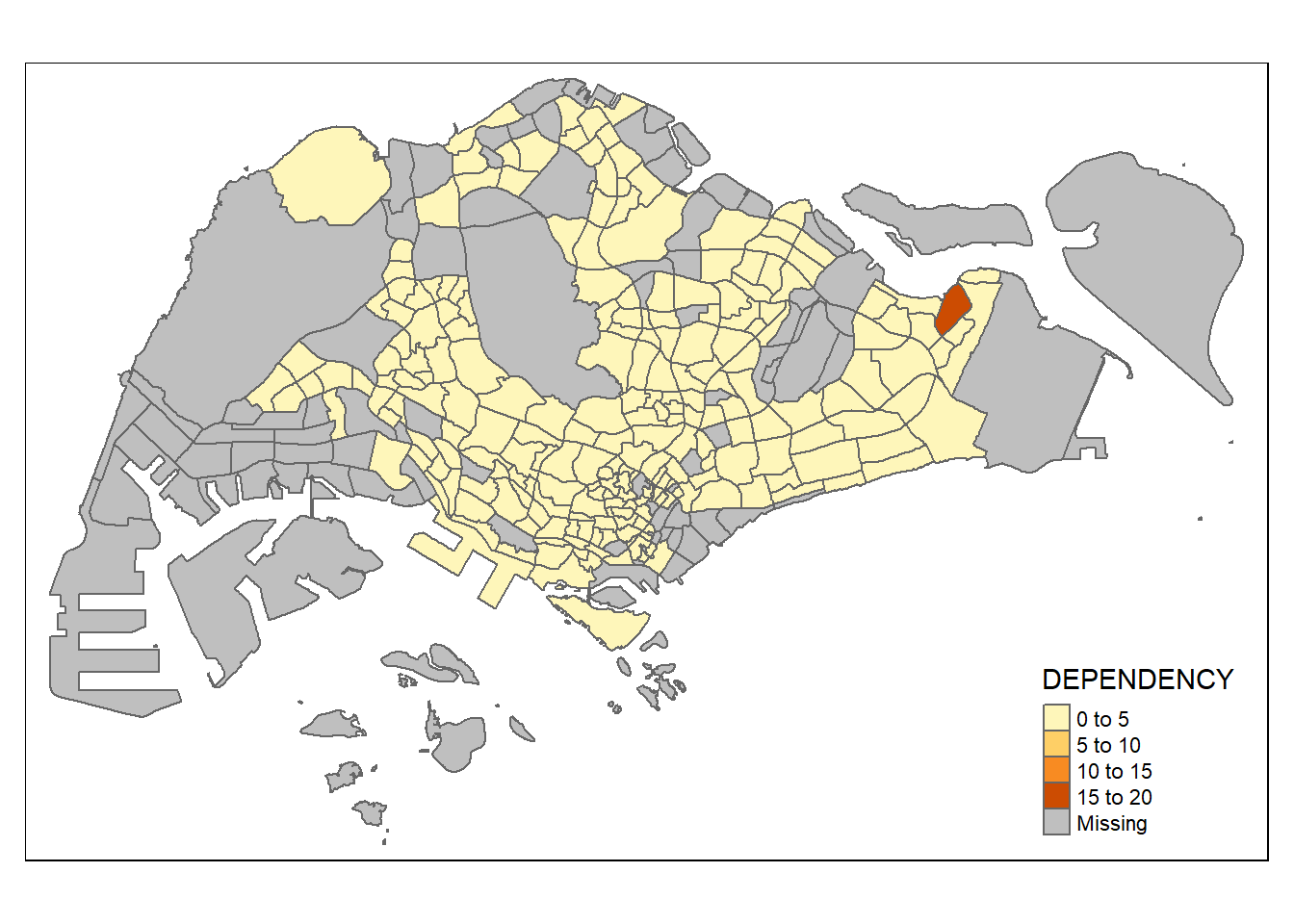To draw a choropleth map showing the geographical distribution of a selected variable by planning subzone, we just need to assign the target variable such as Dependency to tm_polygons().